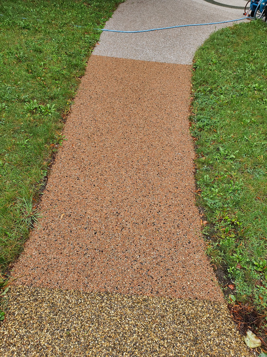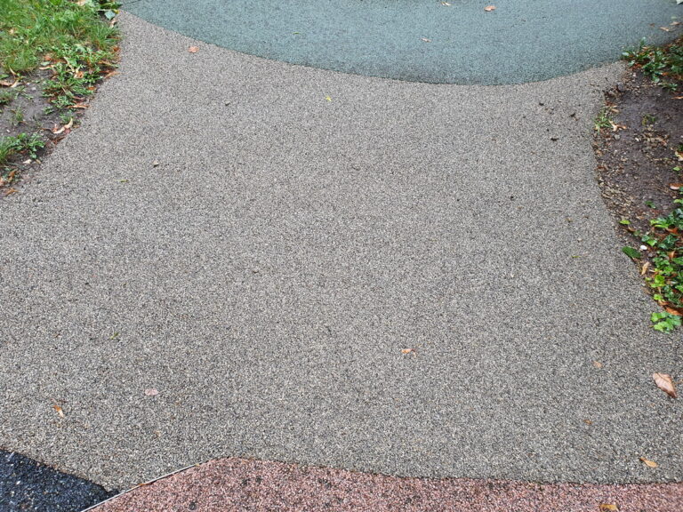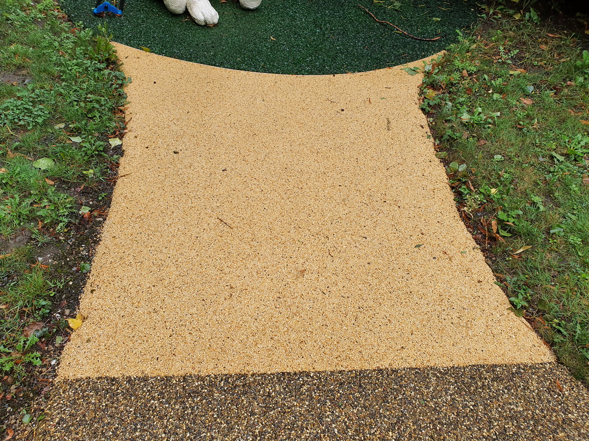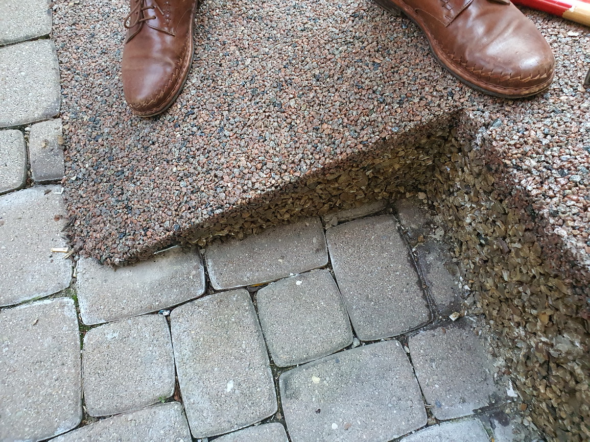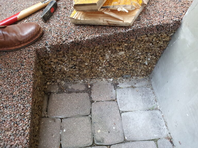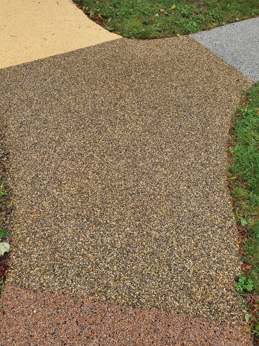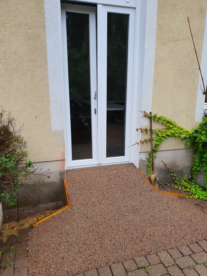 Musterflächen als Weg sowie Platz, ein integriertes Logo, auch Glas als Splitt, LED Beleuchtung unter Terraway