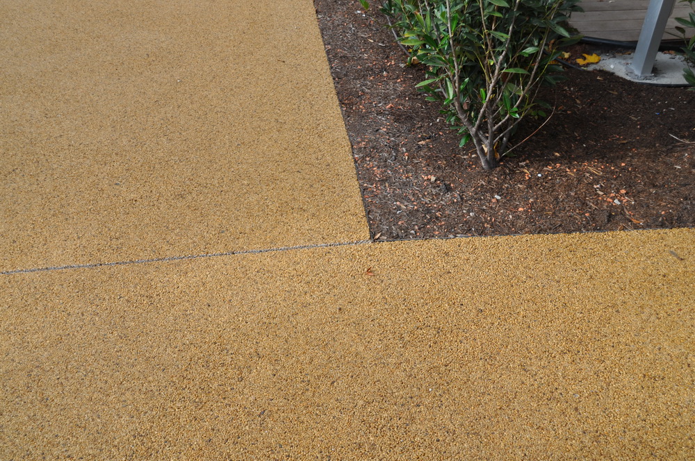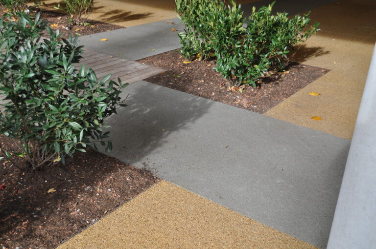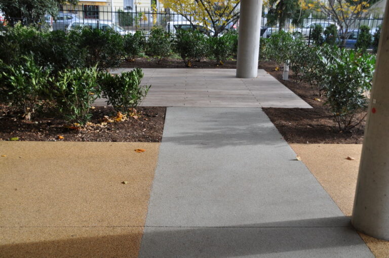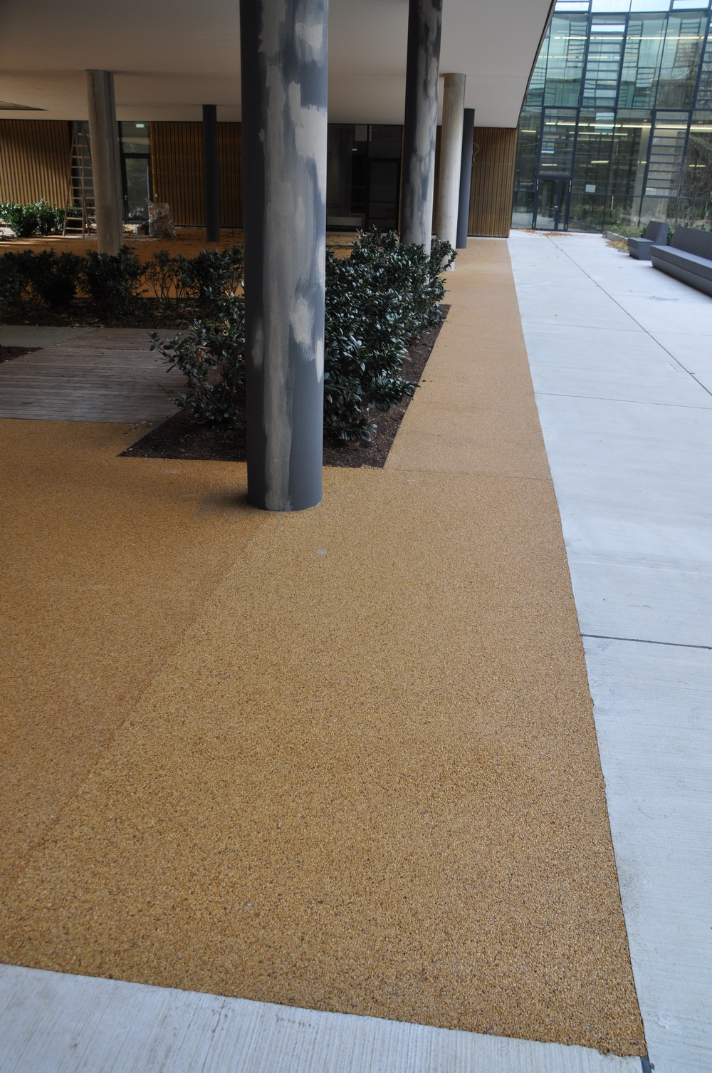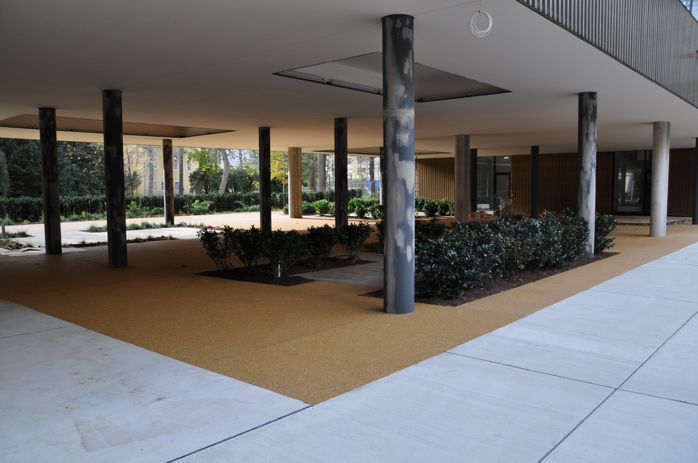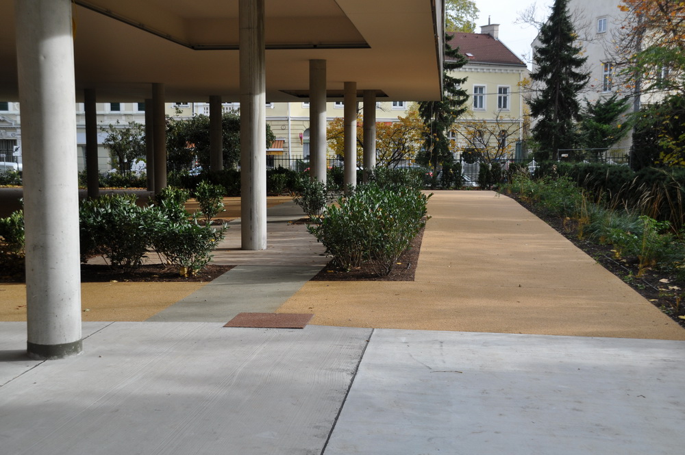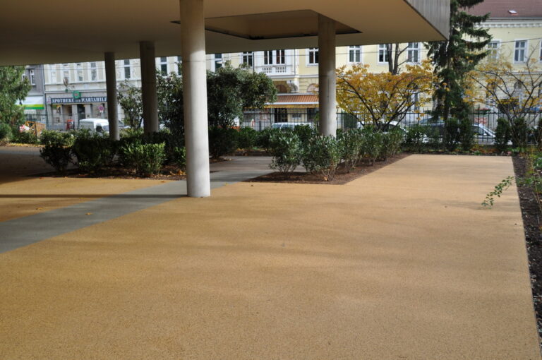 Beim neue Pflegewohnheim Helmut Zilk" in Wien Liesing wurde einen Großteil der Wege und Plätze mit TerraWay verlegt. Nachdem auch einige Flächen überdacht und etwas dünkler sind, haben sich die Landschaftsarchitekten für ein kräftiges Gelb entschieden"