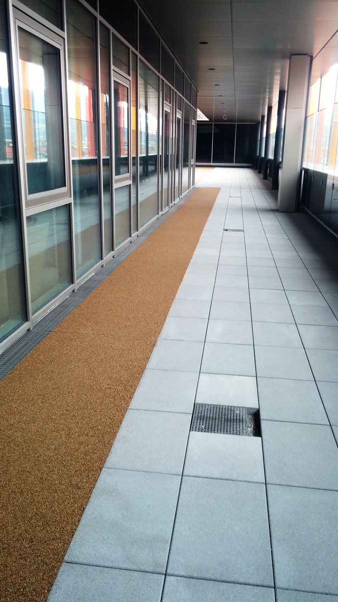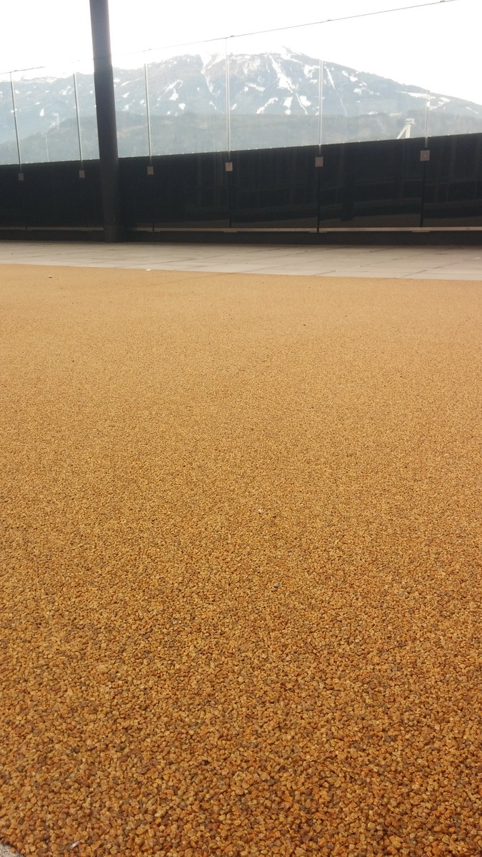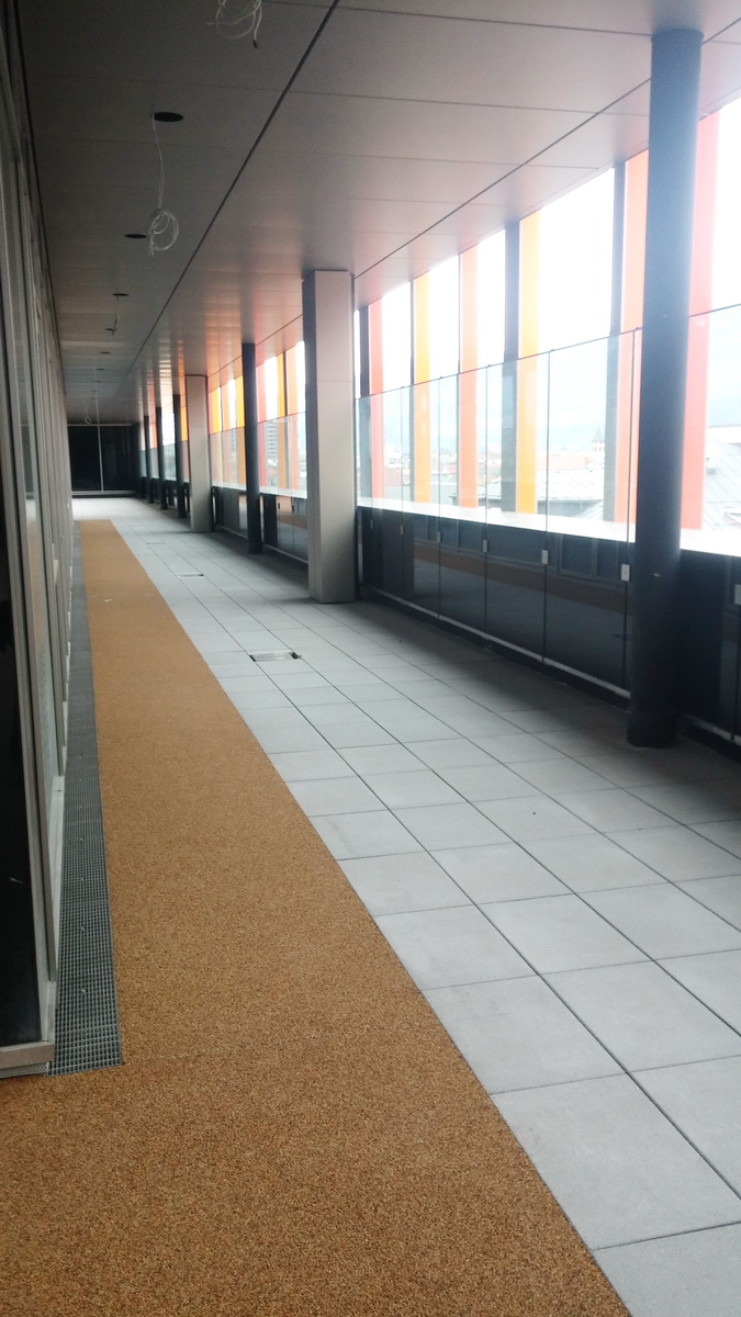 Die Dachterrasse beim Neubau der Universitätsklinik Innsbruck wurden färbig mit gelbem TerraWay als Spielbereich für Kinder (speziell der Kinderherzklinik) gestaltet.