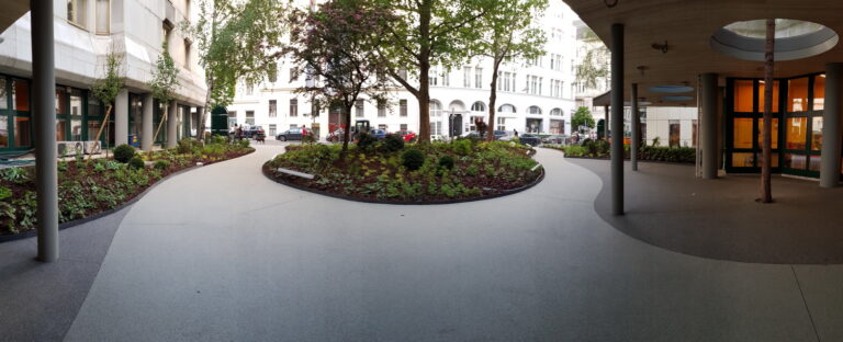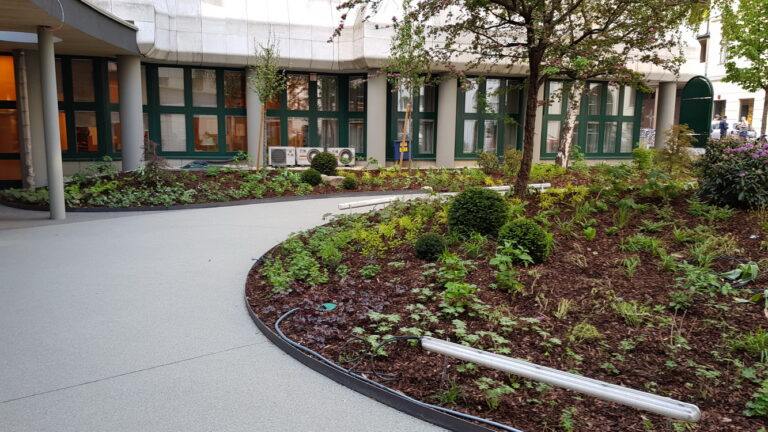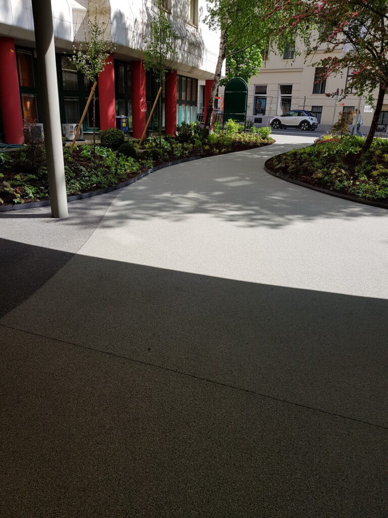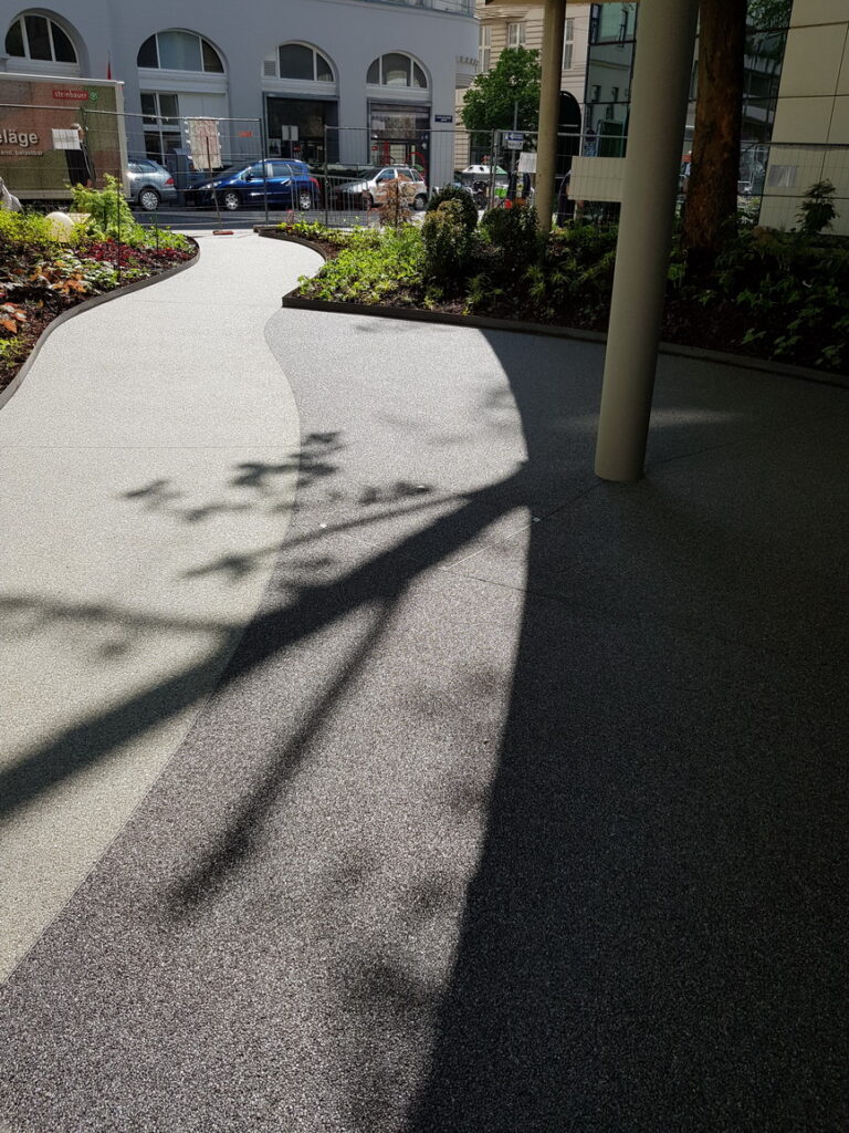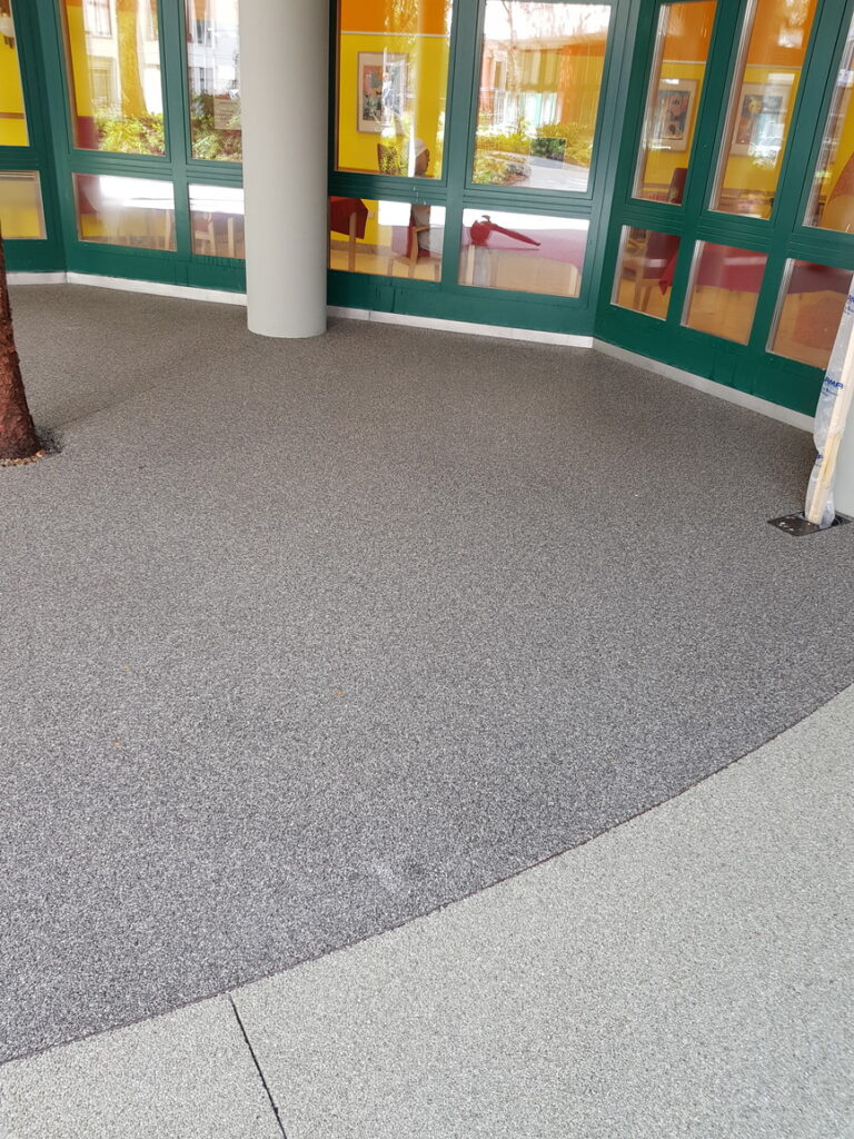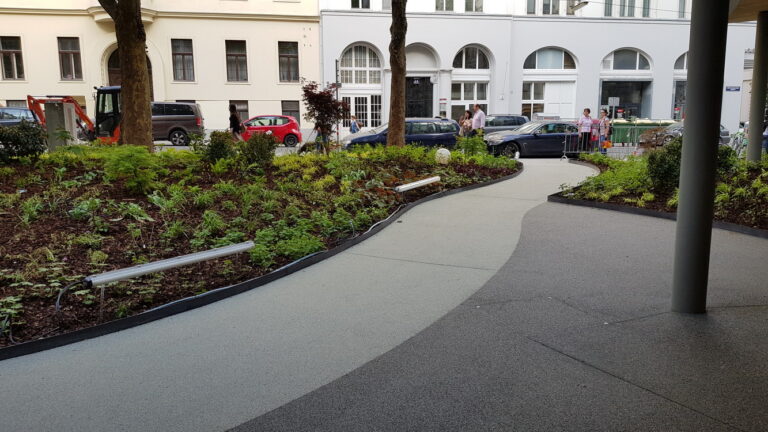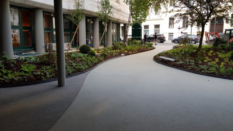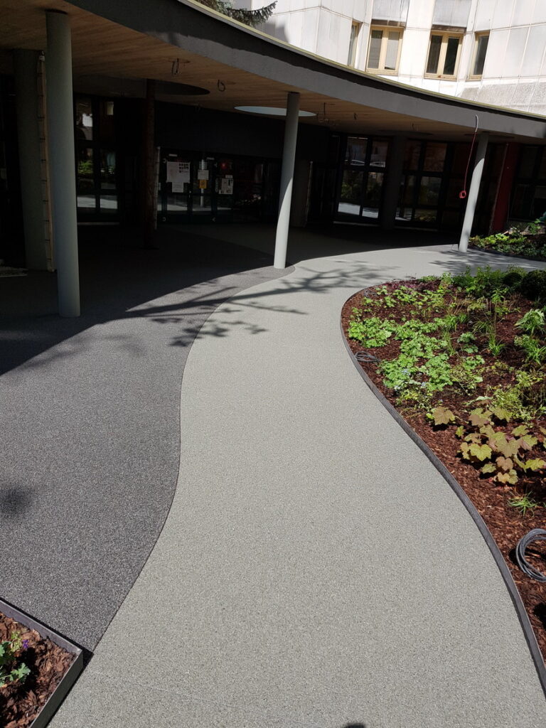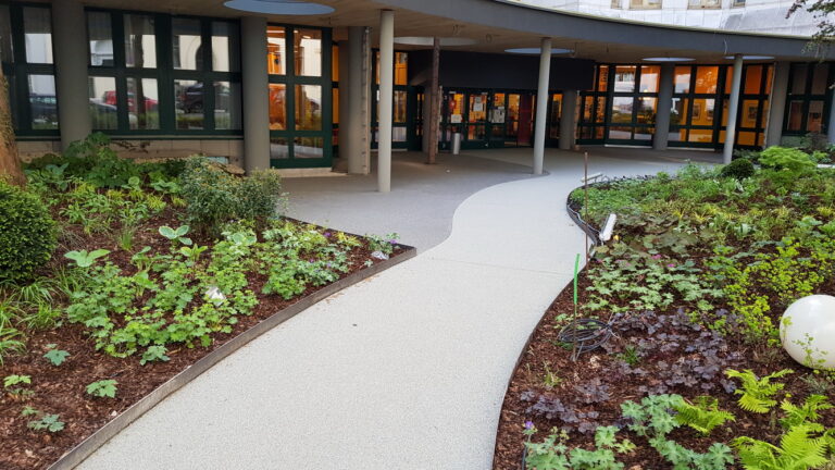Der Haupteingang des KWP Hauses Neubau wurde komplett neu gestaltet. Auch hier wurde möglichst viel entsiegelt, daher TerraWay verwendet